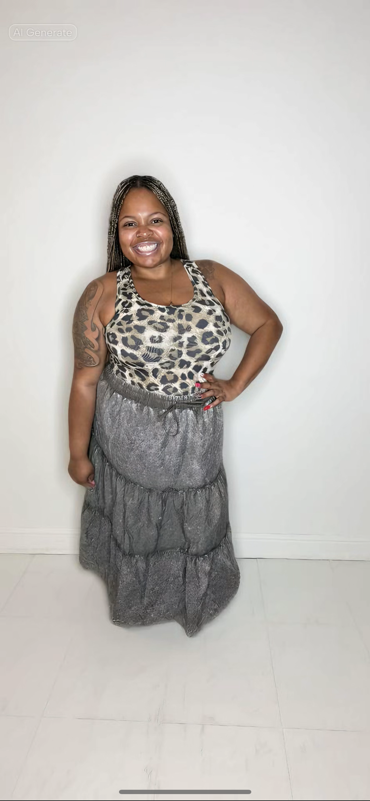 Channel your inner wild thing in this soft statement set. The leopard bodysuit brings the bold, while the tiered skirt adds softness and flow. It’s the perfect balance of fierce and feminine, made for the girl who walks in and owns the room. Bodysuit contains great stretch. The skirt has stretch in the waistband.